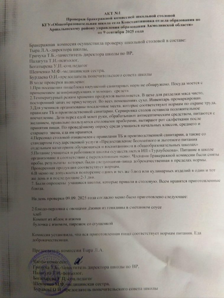 Санитарлық нормалар мен ережелердің талаптарына сәйкес мектеп асханасында дайын өнімге жоспарлы бракераждық тексеру жүргізілді.