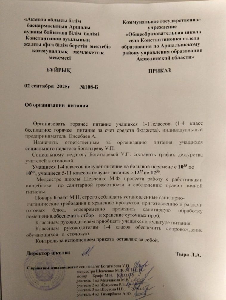 Ыстық тамақты ұйымдастыру туралы бұйрық
